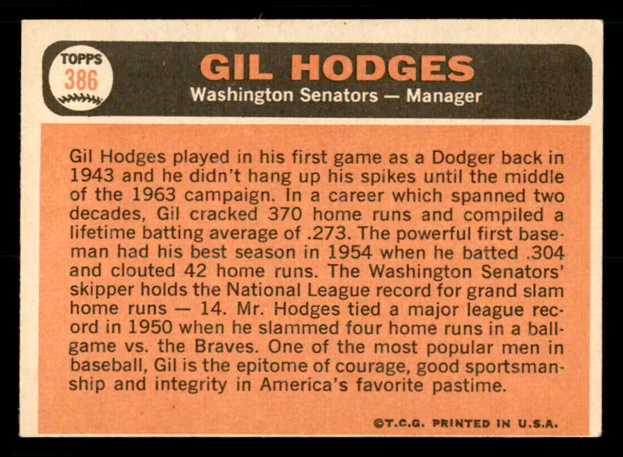1966 Topps Baseball #386 Gil Hodges Senators EX-MT 539760