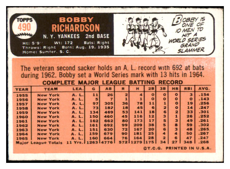 1966 Topps Baseball #490 Bobby Richardson Yankees EX 529049