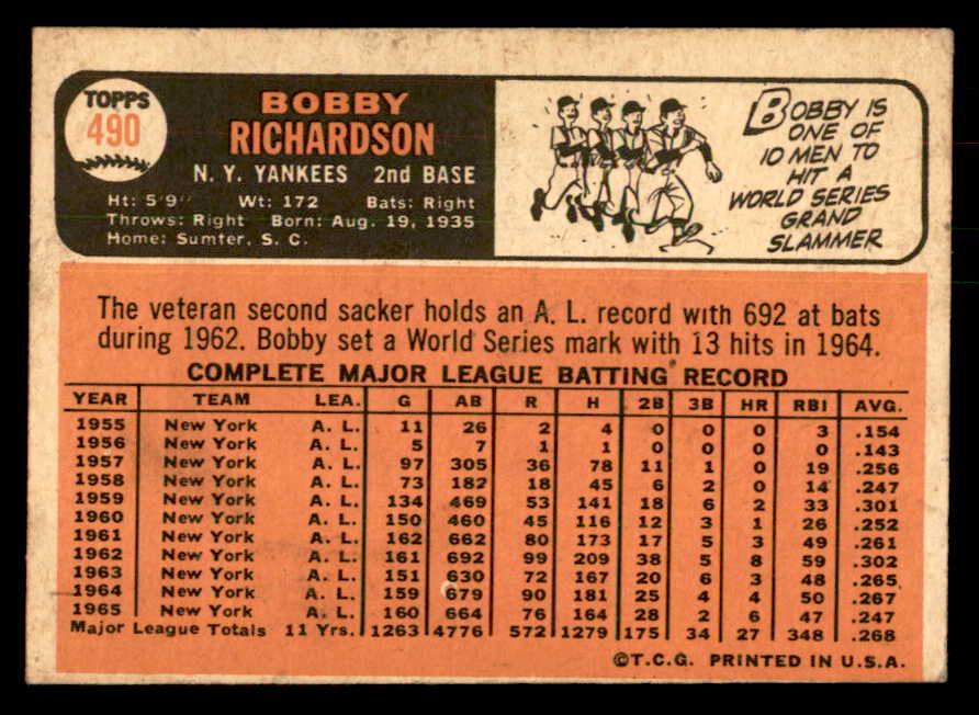 1966 Topps Baseball #490 Bobby Richardson Yankees VG-EX 541321