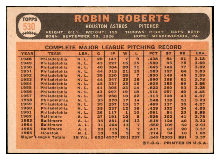 1966 Topps Baseball #530 Robin Roberts Astros VG-EX 531309