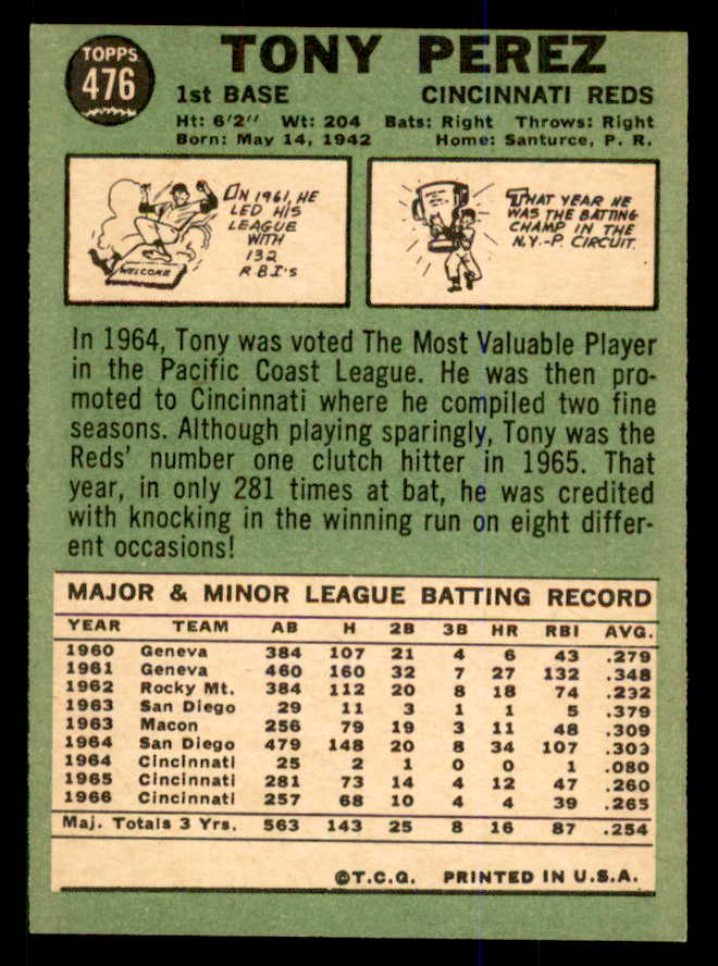 1967 Topps Baseball #476 Tony Perez Reds VG-EX 547858