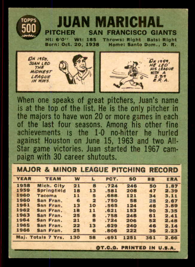 1967 Topps Baseball #500 Juan Marichal Giants EX 545807