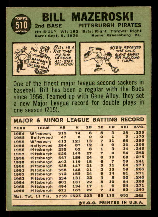 1967 Topps Baseball #510 Bill Mazeroski Pirates NR-MT 546720
