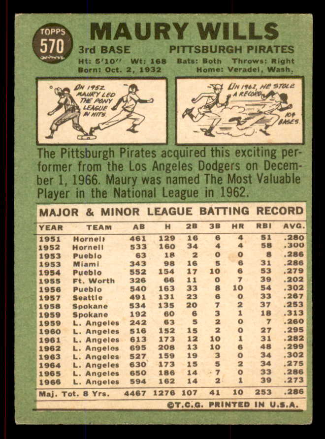 1967 Topps Baseball #570 Maury Wills Pirates EX 545790