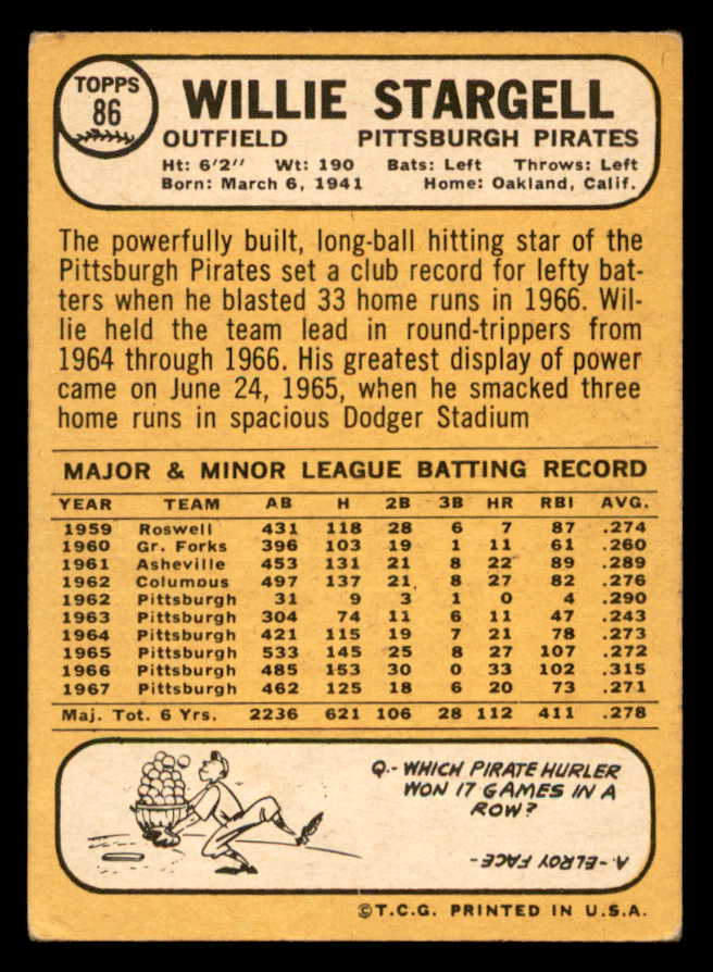 1968 Topps Baseball #086 Willie Stargell Pirates VG-EX 546126