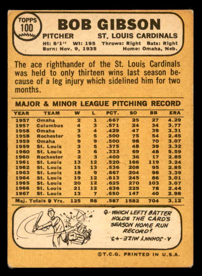 1968 Topps Baseball #100 Bob Gibson Cardinals VG-EX 546106