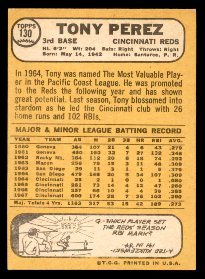1968 Topps Baseball #130 Tony Perez Reds EX 546105