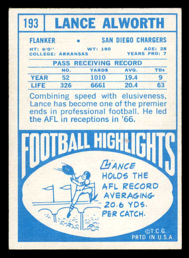 1968 Topps Football #193 Lance Alworth Chargers EX-MT 547128