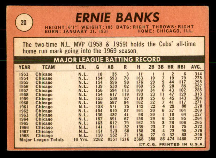 1969 Topps Baseball #020 Ernie Banks Cubs EX 541386