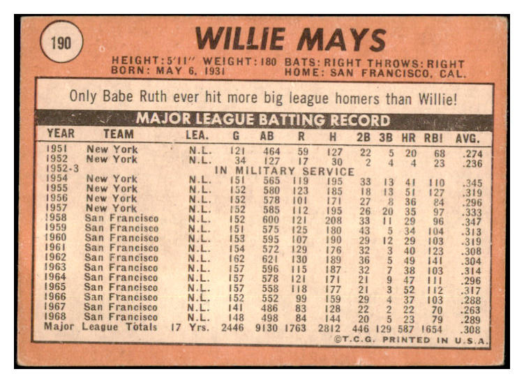1969 Topps Baseball #190 Willie Mays Giants VG 531786