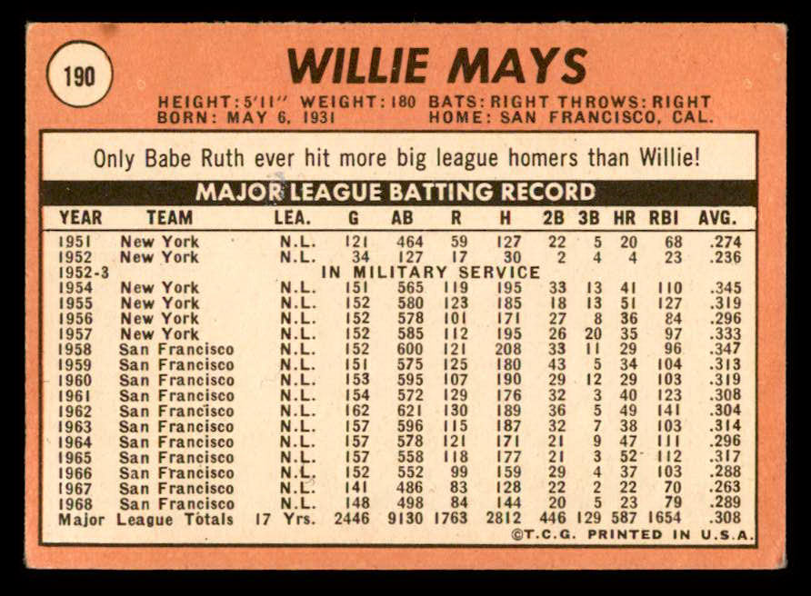 1969 Topps Baseball #190 Willie Mays Giants VG-EX 539280