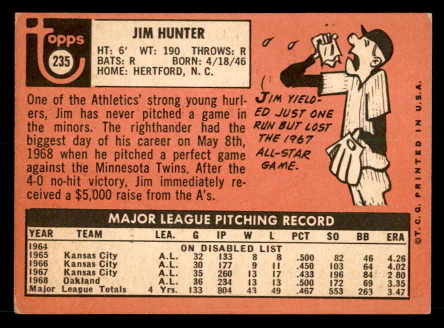 1969 Topps Baseball #235 Catfish Hunter A's VG-EX 539924