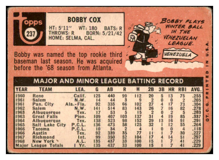 1969 Topps Baseball #237 Bobby Cox Yankees FR-GD 531774