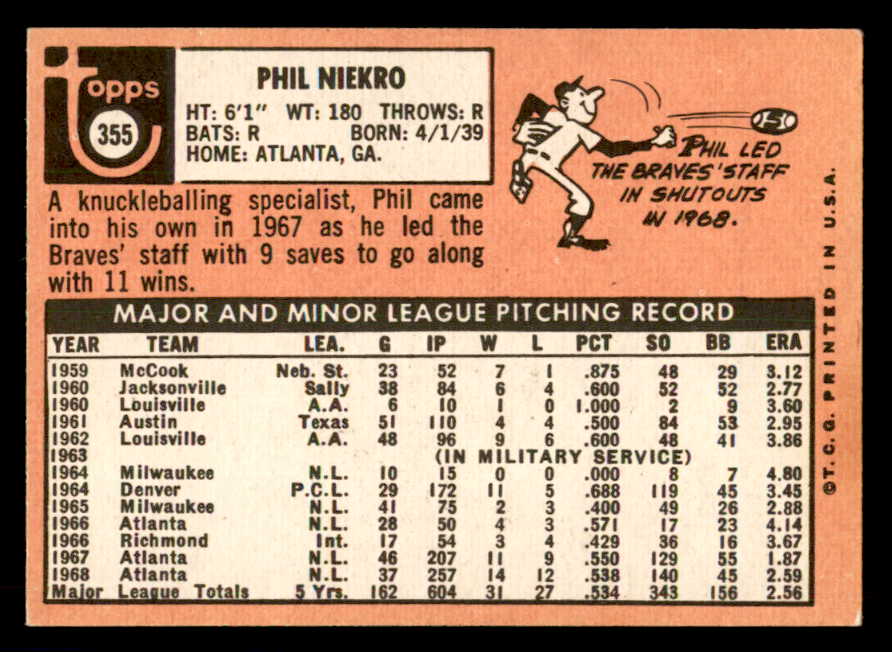 1969 Topps Baseball #355 Phil Niekro Braves EX 541132