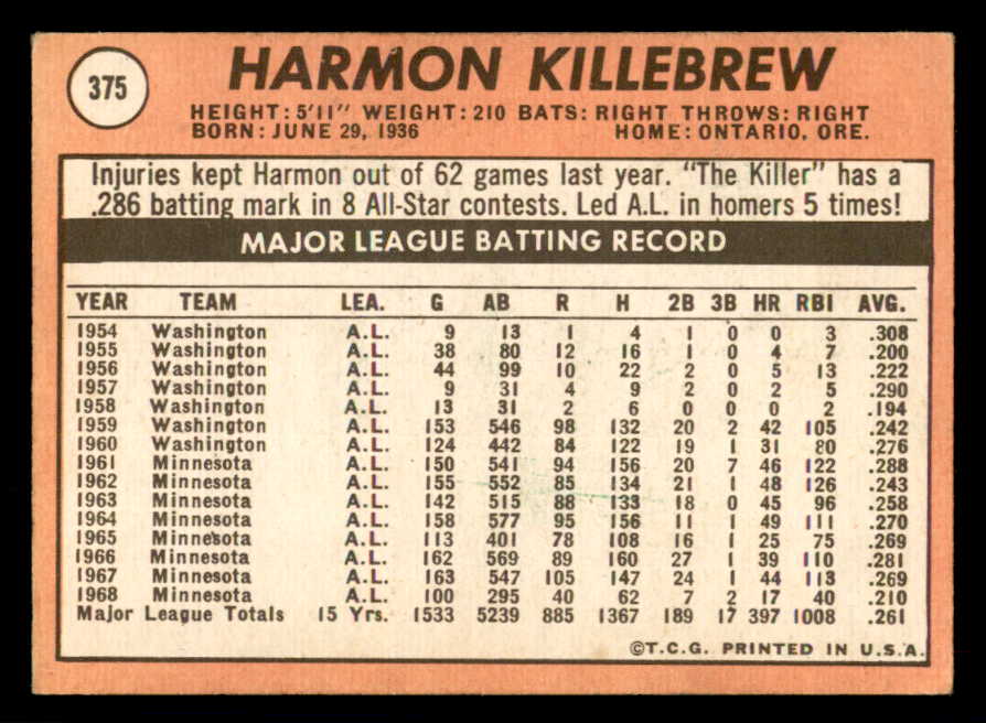 1969 Topps Baseball #375 Harmon Killebrew Twins EX 541138