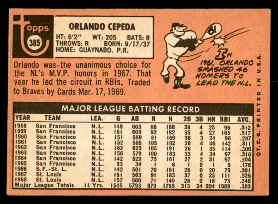 1969 Topps Baseball #385 Orlando Cepeda Braves EX+/EX-MT 541381
