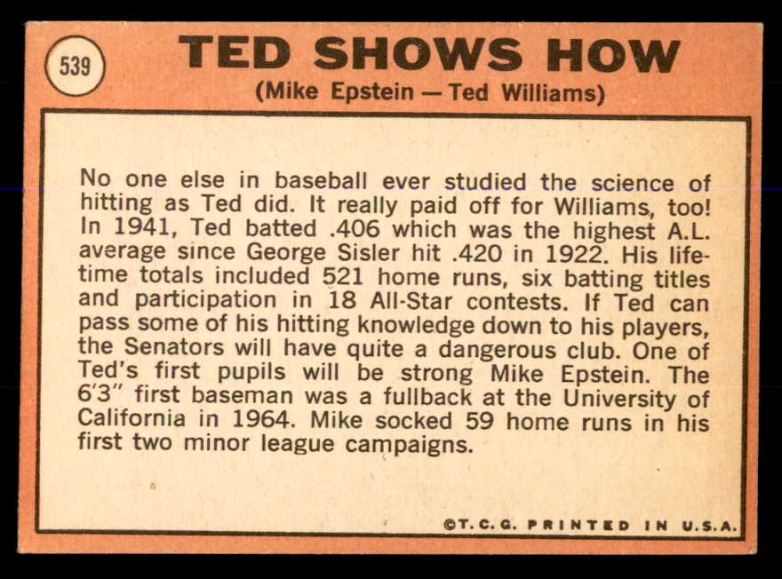 1969 Topps Baseball #539 Ted Williams Mike Epstein EX+/EX-MT 547846