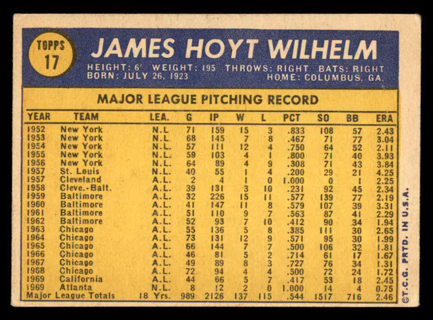 1970 Topps Baseball #017 Hoyt Wilhelm Braves VG-EX 545992