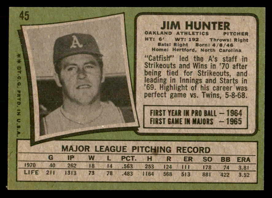 1971 Topps Baseball #045 Catfish Hunter A's EX 541682