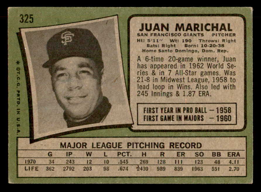 1971 Topps Baseball #325 Juan Marichal Giants VG 541706