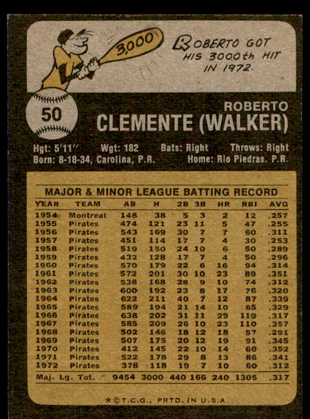1973 Topps Baseball #050 Roberto Clemente Pirates VG-EX 542312