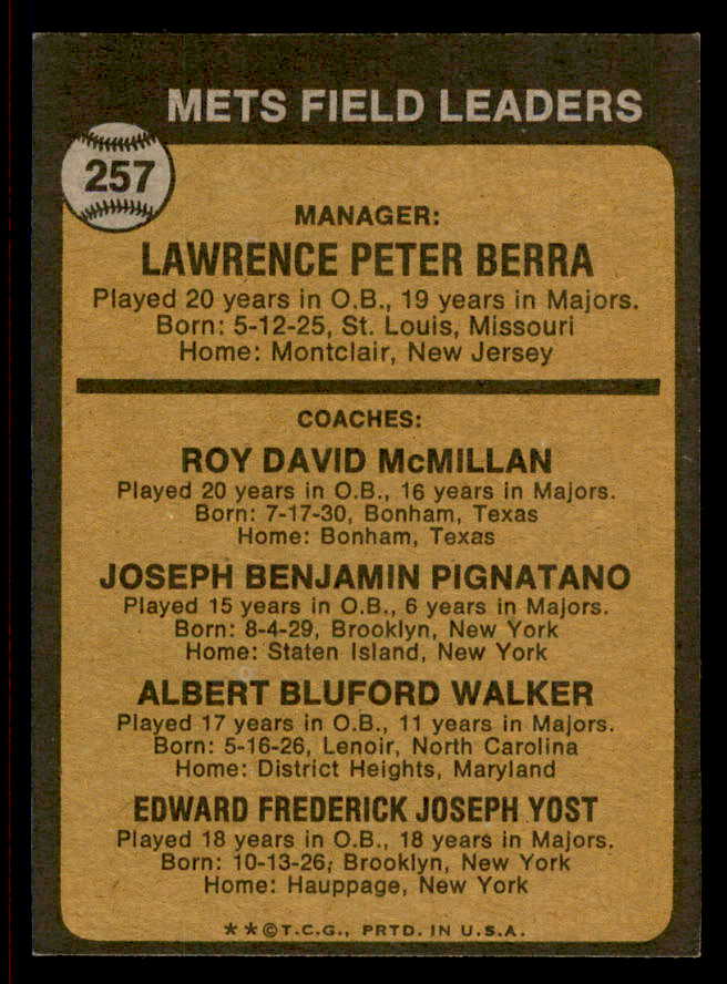 1973 Topps Baseball #257 Yogi Berra Mets NR-MT 542299