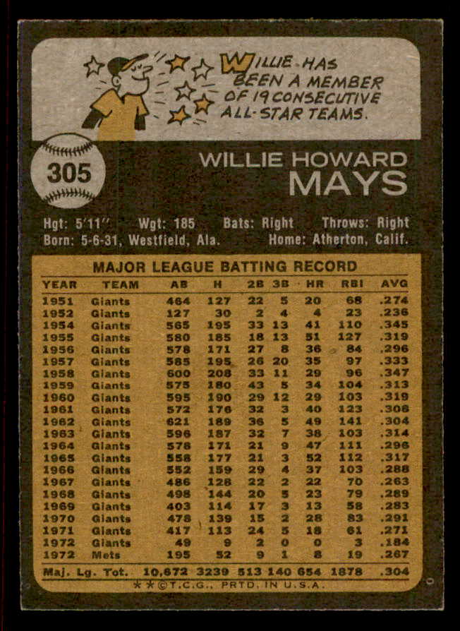 1973 Topps Baseball #305 Willie Mays Mets EX-MT 542288