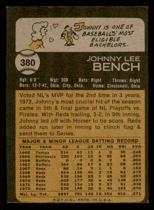 1973 Topps Baseball #380 Johnny Bench Reds EX-MT 542308