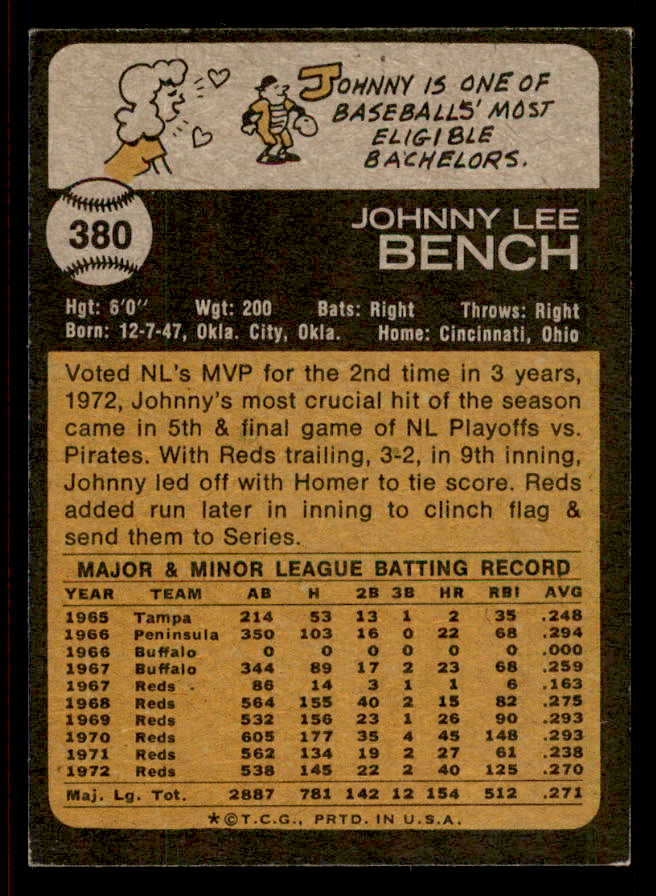 1973 Topps Baseball #380 Johnny Bench Reds EX-MT 542309