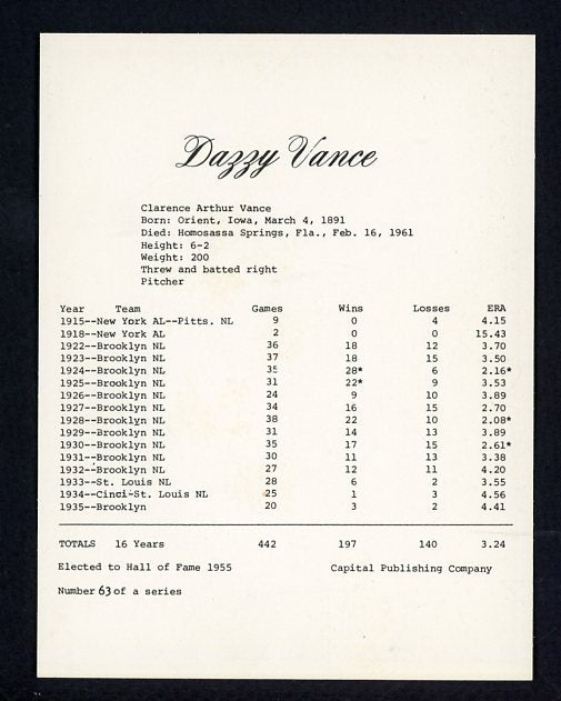 1974 Capital Publishing #063 Dazzy Vance Dodgers NR-MT 537630