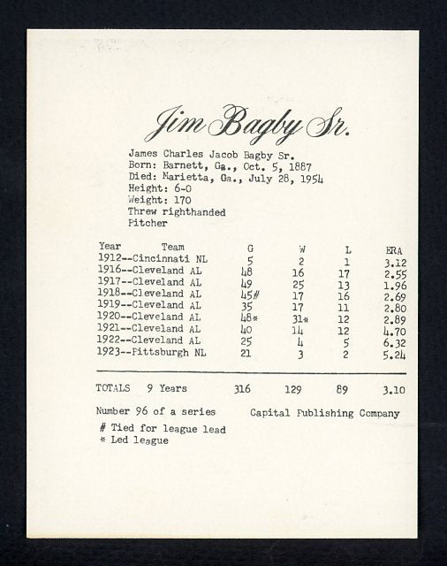1974 Capital Publishing #096 Jim Bagby Indians EX-MT 537660