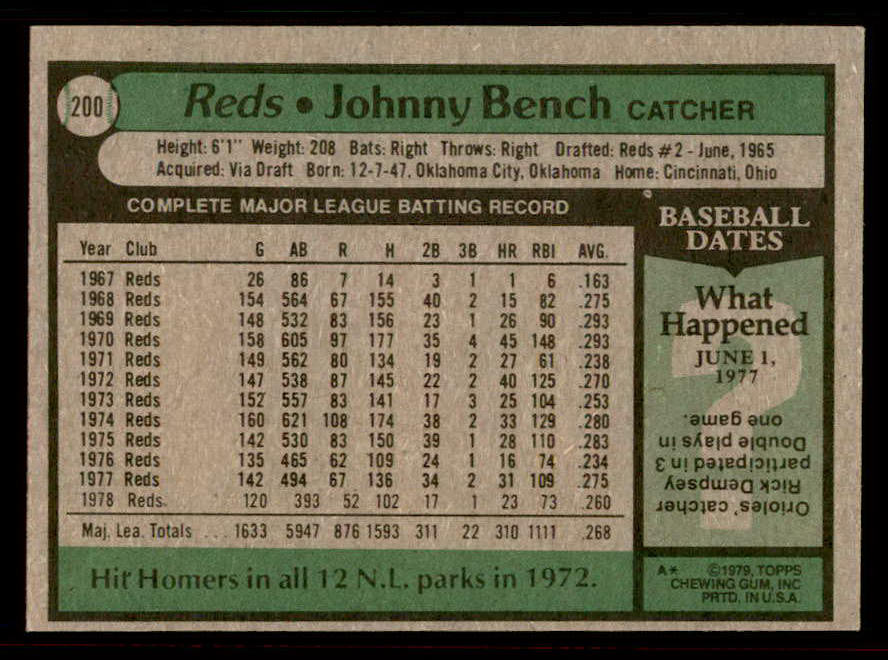 1979 Topps Baseball #200 Johnny Bench Reds EX-MT 542224