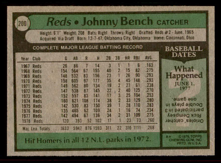 1979 Topps Baseball #200 Johnny Bench Reds EX-MT 542225