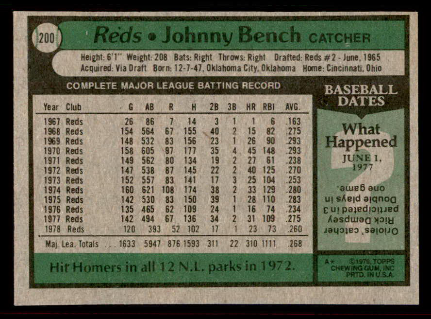 1979 Topps Baseball #200 Johnny Bench Reds EX-MT 542226