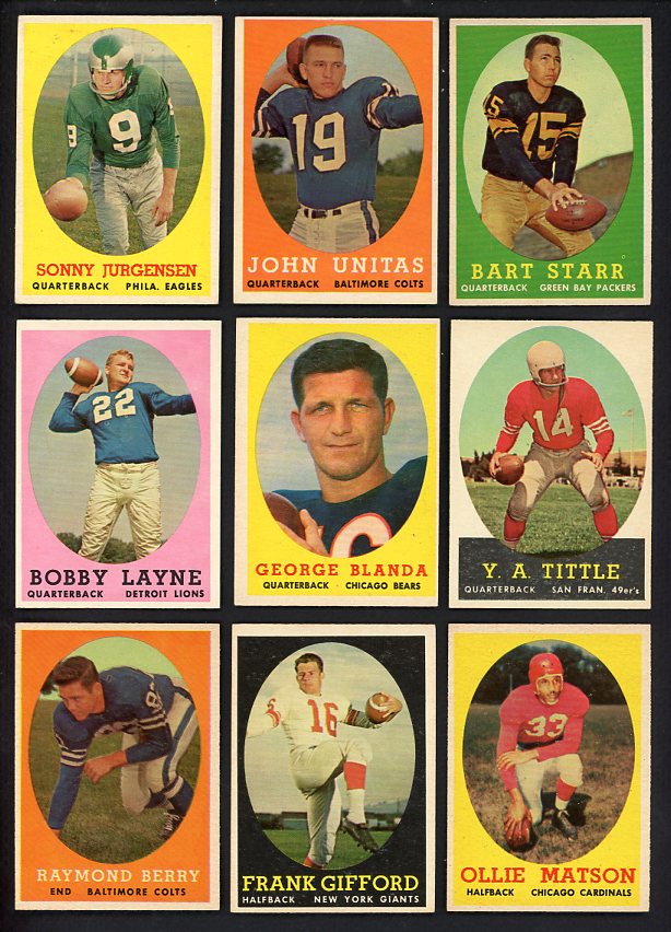 Near set (missing J. Brown) in EX-MT (or better) overall (a couple less). Includes Berry EX-MT, Jurgensen rookie EX, Unitas EX+, Starr VG-EX, Layne NR-MT, Blanda EX+, Tittle EX-MT, Matson EX-MT, Gifford EX+/EX-MT, etc. Buy with confidence. We are the oldest full-time dealer in America, serving collectors since 1976. ALL CARDS ARE SUBJECT TO YOUR APPROVAL. If you ever receive anything that is unsatisfactory you may return it for replacement or full refund. The card pictured is the actual card you will receive. For orders or assistance, call our Toll Free number 888-548-9686 weekdays 8-6 Pacific.