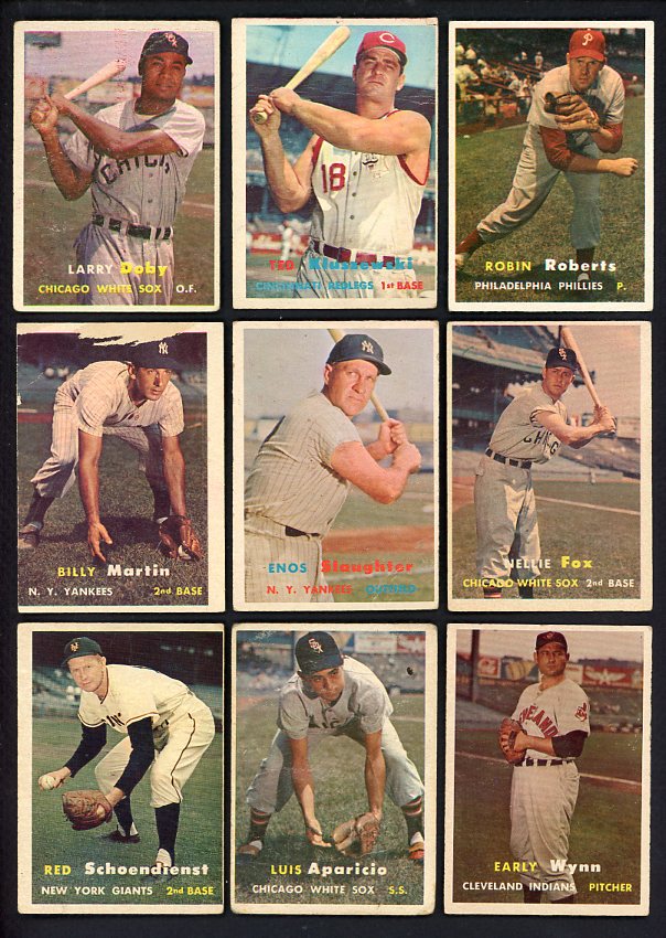 1957 Topps Baseball lot of 88 different in bargain grade (VG and below). Includes B. Martin, Fox, Schoendienst, Aparicio, Wynn, Larsen, Doby, Kluszewski, Roberts, Slaughter, C. Boyer rookie, McDougald, Furillo, Face, Thomson, Turley, Score, Friend, Pierce, Erskine, Gilliam, 6 team cards, 10 mid series, etc. Buy with confidence. We are the oldest full-time dealer in America, serving collectors since 1976. ALL CARDS ARE SUBJECT TO YOUR APPROVAL. If you ever receive anything that is unsatisfactory you may return it for replacement or full refund. The card pictured is the actual card you will receive. For orders or assistance, call our Toll Free number 888-548-9686 weekdays 8-6 Pacific.