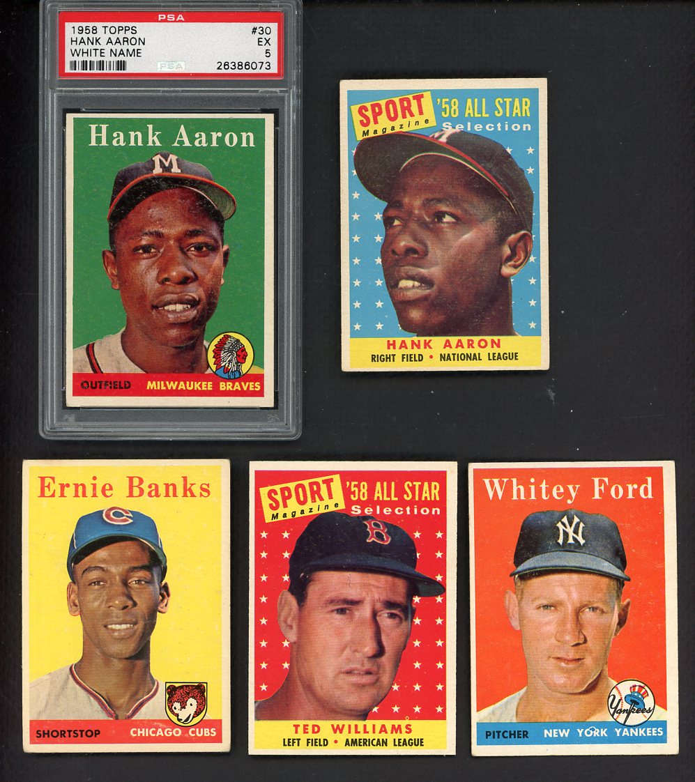 Very steady mid-grade set. Most cards EX, good number nice VG-EX, small number less. Includes Williams EX+, Clemente EX-MT oc, F. Robinson EX-MT, Koufax VG-EX, Mantle GD-VG, Aaron PSA 5 EX, Mantle A.S. VG-EX, Aaron A.S. EX, Mays A.S. EX mc, Williams A.S. NR-MT, Mantle/Aaron #418 EX-MT, Berra GD-VG, Cepeda rookie EX-MT oc, Ford EX, B. Robinson EX, Banks VG-EX, Killebrew EX, Maris rookie NR-MT oc, Mays EX, etc. Full guide 12,000.00. Buy with confidence. We are the oldest full-time dealer in America, serving collectors since 1976. ALL CARDS ARE SUBJECT TO YOUR APPROVAL. If you ever receive anything that is unsatisfactory you may return it for replacement or full refund. The card pictured is the actual card you will receive. For orders or assistance, call our Toll Free number 888-548-9686 weekdays 8-6 Pacific.