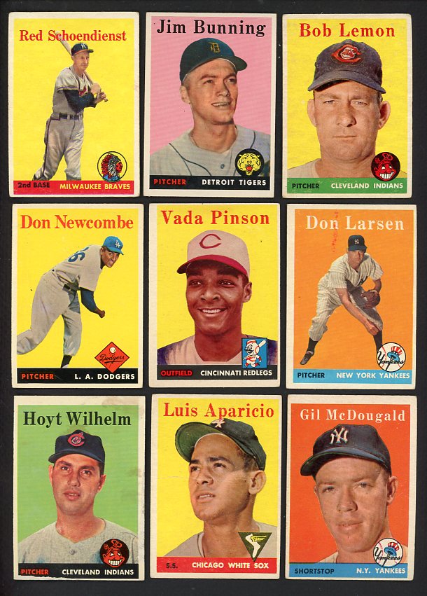 1958 Topps Baseball lot of 61 different in bargain grade (VG and below). Includes Larsen, Wilhelm, Aparicio, McDougald, Friend, Burgess, Lemon, Bunning, Schoendienst, Newcombe, Pinson rookie, Friend#334, 1 team card, 12 low numbers, etc. Buy with confidence. We are the oldest full-time dealer in America, serving collectors since 1976. ALL CARDS ARE SUBJECT TO YOUR APPROVAL. If you ever receive anything that is unsatisfactory you may return it for replacement or full refund. The card pictured is the actual card you will receive. For orders or assistance, call our Toll Free number 888-548-9686 weekdays 8-6 Pacific.