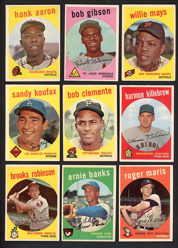 1959 Topps Baseball near set (missing Mantle and Mantle A.S.) in solid EX to EX+ condition overall. Includes Gibson rookie EX/EX+, Clemente VG-EX, Aaron EX, Mays VG-EX, Mays A.S. VG-EX, Aaron A.S. EX-MT, Campanella VG-EX, Mantle IA EX+, Maris EX-MT, Aaron #212 EX+, Snider EX, Koufax VG-EX, Mays #317 EX-MT, Banks EX+, Drysdale EX+, B. Robinson EX-MT/NR-MT, Killebrew EX, Clemente #543 VG-EX, etc. Buy with confidence. We are the oldest full-time dealer in America, serving collectors since 1976. ALL CARDS ARE SUBJECT TO YOUR APPROVAL. If you ever receive anything that is unsatisfactory you may return it for replacement or full refund. The card pictured is the actual card you will receive. For orders or assistance, call our Toll Free number 888-548-9686 weekdays 8-6 Pacific.