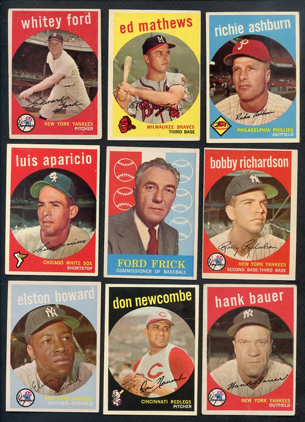 120 different, mainly VG-EX or EX (no creasing on nearly all cards), a few less. Includes Ford, Mathews, Ashburn, Banks #147, Aparicio, Richardson, Newcombe, Bauer, Erskine, 7 team cards, about 28 cards #1-110, etc. Retail 470-480.00. Buy with confidence. We are the oldest full-time dealer in America, serving collectors since 1976. ALL CARDS ARE SUBJECT TO YOUR APPROVAL. If you ever receive anything that is unsatisfactory you may return it for replacement or full refund. The card pictured is the actual card you will receive. For orders or assistance, call our Toll Free number 888-548-9686 weekdays 8-6 Pacific.