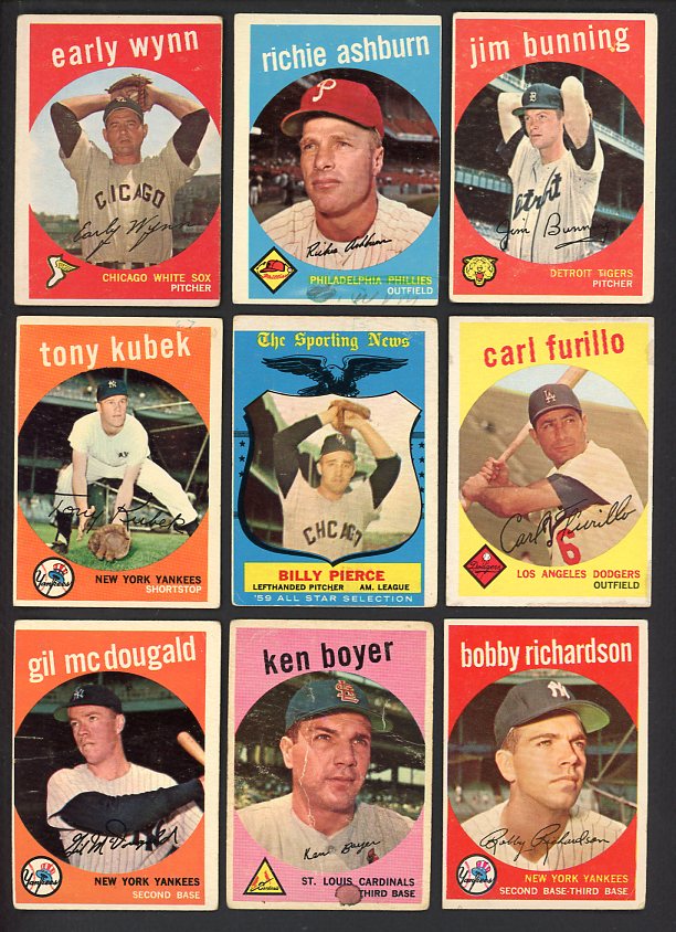 1959 Topps Baseball lot of 121 different in bargain grade (VG and below). Includes Aparicio/Fox #408, Wynn, Ashburn, Bunning, Kubek, Kuenn, Pafko, Maglie, Pierce A.S., Furillo, McDougald, K. Boyer, Richardson, D. Johnson rookie, Thomson, Labine, Blanchard rookie, Jensen, Fairly rookie, 2 high numbers, 7 team cards, 19 low numbers, etc. Buy with confidence. We are the oldest full-time dealer in America, serving collectors since 1976. ALL CARDS ARE SUBJECT TO YOUR APPROVAL. If you ever receive anything that is unsatisfactory you may return it for replacement or full refund. The card pictured is the actual card you will receive. For orders or assistance, call our Toll Free number 888-548-9686 weekdays 8-6 Pacific.