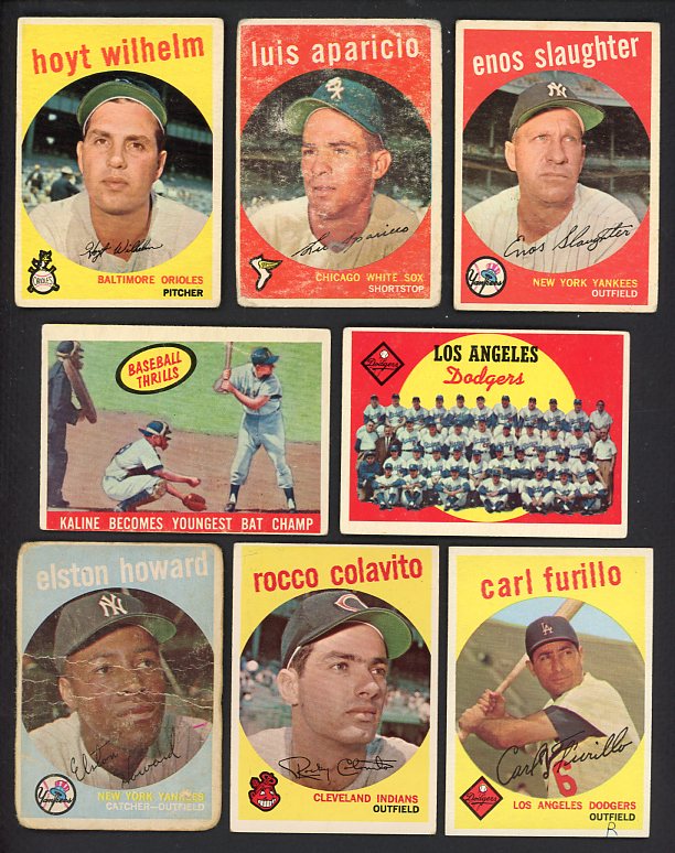 1959 Topps Baseball lot of 121 different in bargain grade (VG and below). Includes Kaline #463, E. Howard, Colavito, Furillo, Allison rookie, Wilhelm, Slaughter, Aparicio, Richardson #237, K. Boyer, Bauer, Stengel #383, Kubek, C. Boyer, Pierce, Burgess, 2 high numbers, 3 team cards, 19 low numbers, etc. Buy with confidence. We are the oldest full-time dealer in America, serving collectors since 1976. ALL CARDS ARE SUBJECT TO YOUR APPROVAL. If you ever receive anything that is unsatisfactory you may return it for replacement or full refund. The card pictured is the actual card you will receive. For orders or assistance, call our Toll Free number 888-548-9686 weekdays 8-6 Pacific.