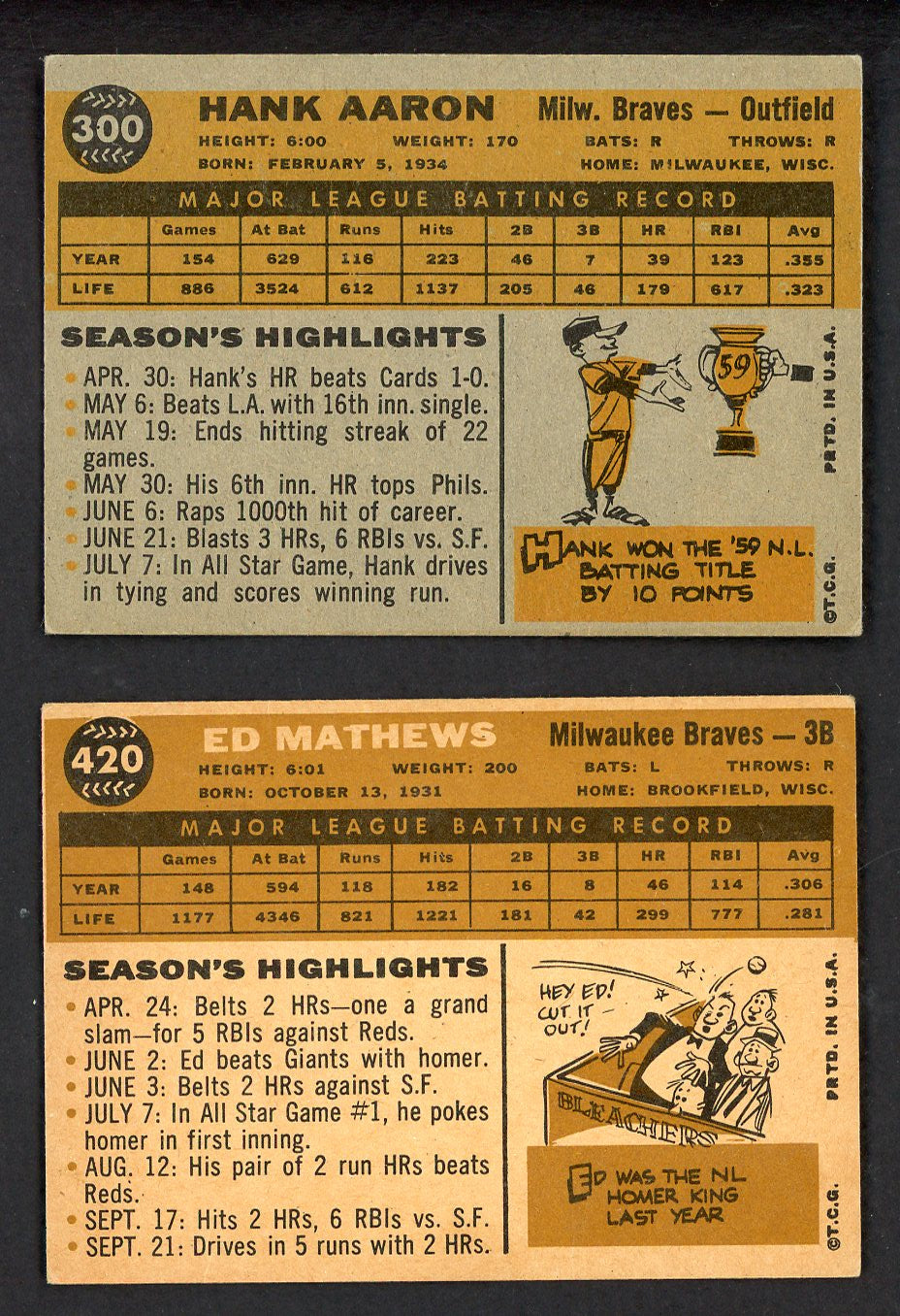 1960 Topps Lot #300 Hank Aaron #420 Eddie Mathews Nice 543316