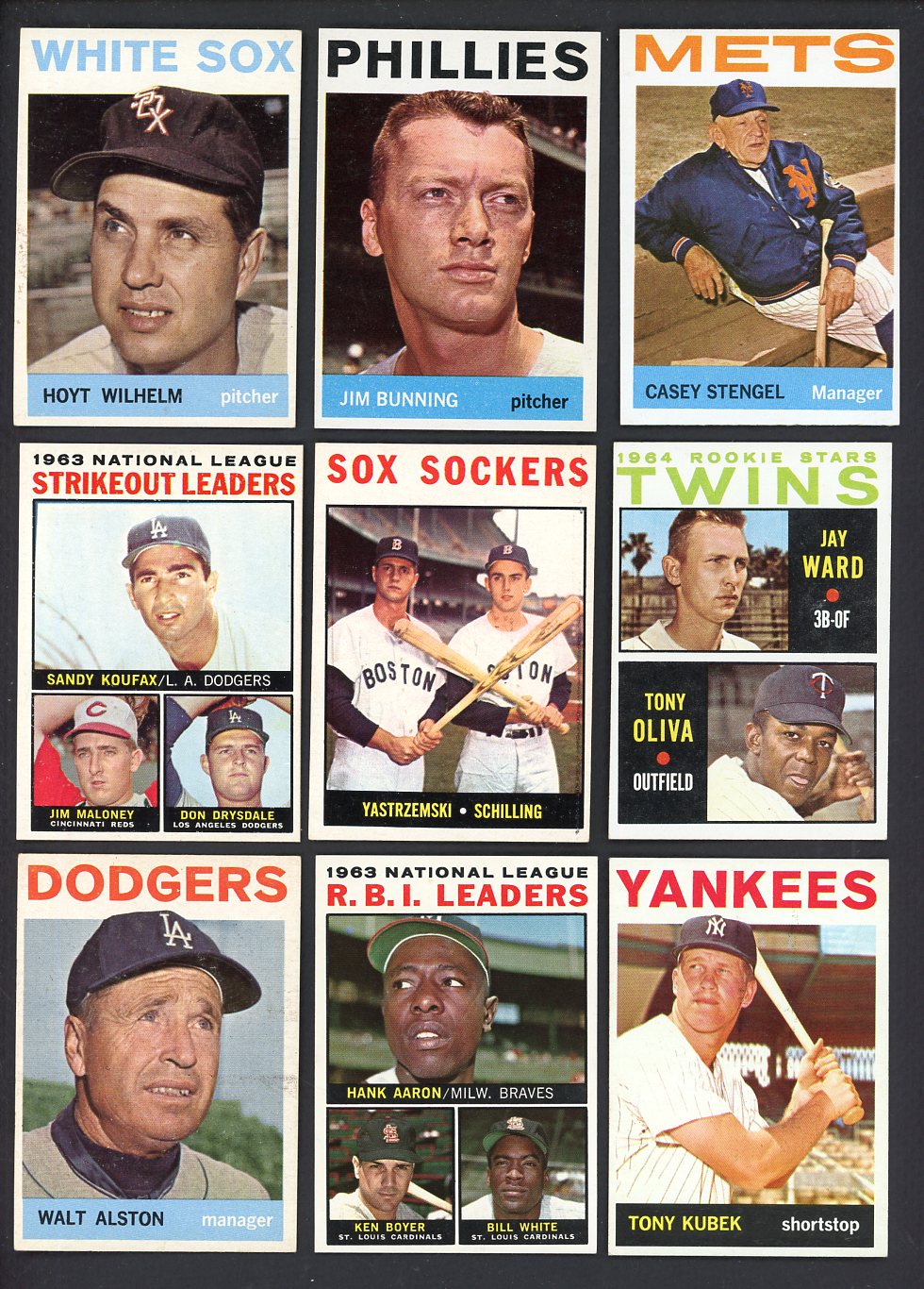 1964 Topps Baseball lot of 466 different in EX-MT condition overall (some EX+/EX-MT). Includes Wilhelm, Bunning, Stengel, Yastrzemski #182, Oliva, Alston, Kubek, J. Wynn rookie, Stengel #393, Bouton, 16 team cards, 5 checklists, 10 leader cards, 4 World Series cards, etc. Buy with confidence. We are the oldest full-time dealer in America, serving collectors since 1976. ALL CARDS ARE SUBJECT TO YOUR APPROVAL. If you ever receive anything that is unsatisfactory you may return it for replacement or full refund. The card pictured is the actual card you will receive. For orders or assistance, call our Toll Free number 888-548-9686 weekdays 8-6 Pacific.