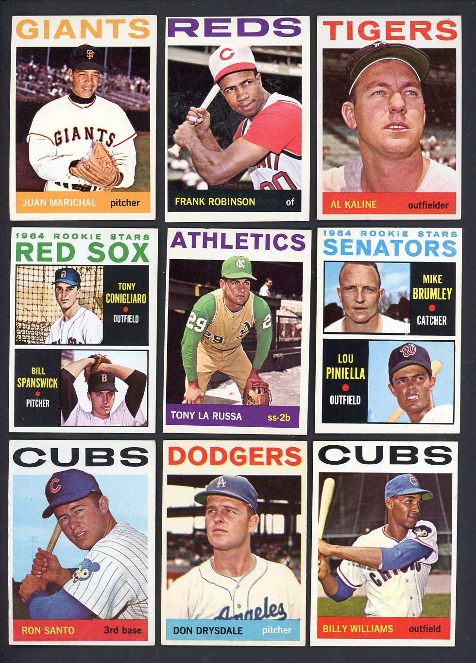 1964 Topps Baseball lot of 505 different in EX condition overall (many EX-MT, some VG-EX). Includes Marichal, F. Robinson, Kaline, Conigliaro rookie, Larussa rookie, Piniella rookie, Santo, Drysdale, B. Williams, K. Boyer, E. Howard, McCovey #41, Colavito, Fox, Bunning, Kubek, Killebrew #81, Roberts, Flood, Stengel, Hodges, Wilhelm, Torre, 14 team cards, 4 leader cards, 4 World Series cards, 4 checklists, 54 high numbers, etc. Buy with confidence. We are the oldest full-time dealer in America, serving collectors since 1976. ALL CARDS ARE SUBJECT TO YOUR APPROVAL. If you ever receive anything that is unsatisfactory you may return it for replacement or full refund. The card pictured is the actual card you will receive. For orders or assistance, call our Toll Free number 888-548-9686 weekdays 8-6 Pacific.