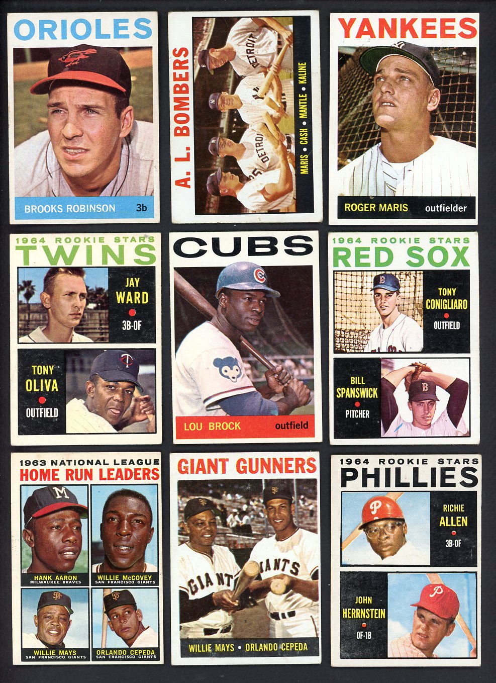 Huge lot/near set of 1964 Topps Baseball. Missing #25, 50, 125, 146, 190, 194, 300, 350, couple others. Mainly mid-grade VG-EX and EX (some EX-MT) with a small number VG/less. Great value - this would cost a small fortune to put together card-by-card. Includes Mantle #331 VG-EX, Allen rookie VG/VG-EX creased, B. Robinson VG-EX, Maris EX-MT oc, Yastrzemski VG-EX/EX, Koufax VG-EX, Mays EX oc, Brock EX+/EX-MT, Berra VG-EX/EX, Stargell EX-MT, Mays #306 EX, Conigliaro rookie VG-EX, F. Robinson EX, Oliva VG-EX, Leader #9 EX-MT, Gibson EX+, Clemente nice but miscut, Aaron/Mays #423 VG-EX, 10 leader cards, virtually all teams, checklists, World Series cards, minor stars, etc. Full Guide 8000.00. Buy with confidence. We are the oldest full-time dealer in America, serving collectors since 1976. ALL CARDS ARE SUBJECT TO YOUR APPROVAL. If you ever receive anything that is unsatisfactory you may return it for replacement or full refund. The card pictured is the actual card you will receive. For orders or assistance, call our Toll Free number 888-548-9686 weekdays 8-6 Pacific.