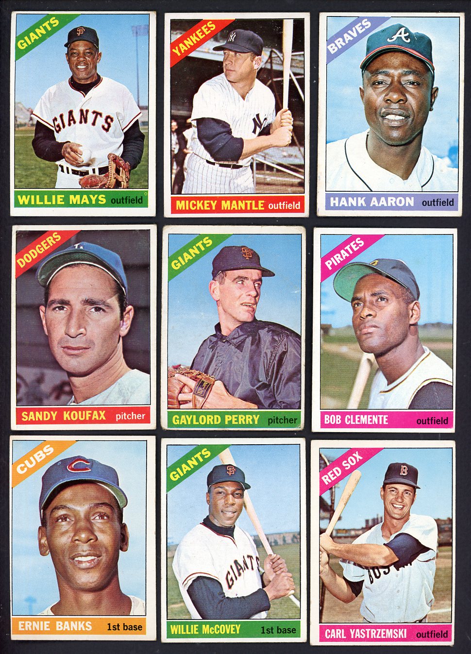 1966 Topps Baseball complete set in solid mid-grade VG-EX (many better/a few less). Includes Mays VG-EX, Rose VG, Mantle EX, Yastrzemski VG-EX, Perez VG-EX, Koufax VG, Banks VG-EX, Brock EX, Palmer rookie EX, Killebrew EX, Leader #215 EX+, Stargell EX, Jenkins rookie VG-EX, Sutton rookie VG, Clemente EX, F. Robinson EX, Gibson VG-EX, Maris VG-EX, B. Robinson EX, Kaline EX-MT, Aaron VG-EX, McCovey VG-EX, B. Williams VG-EX, Perry GD-VG, etc. Buy with confidence. We are the oldest full-time dealer in America, serving collectors since 1976. ALL CARDS ARE SUBJECT TO YOUR APPROVAL. If you ever receive anything that is unsatisfactory you may return it for replacement or full refund. The card pictured is the actual card you will receive. For orders or assistance, call our Toll Free number 888-548-9686 weekdays 8-6 Pacific.