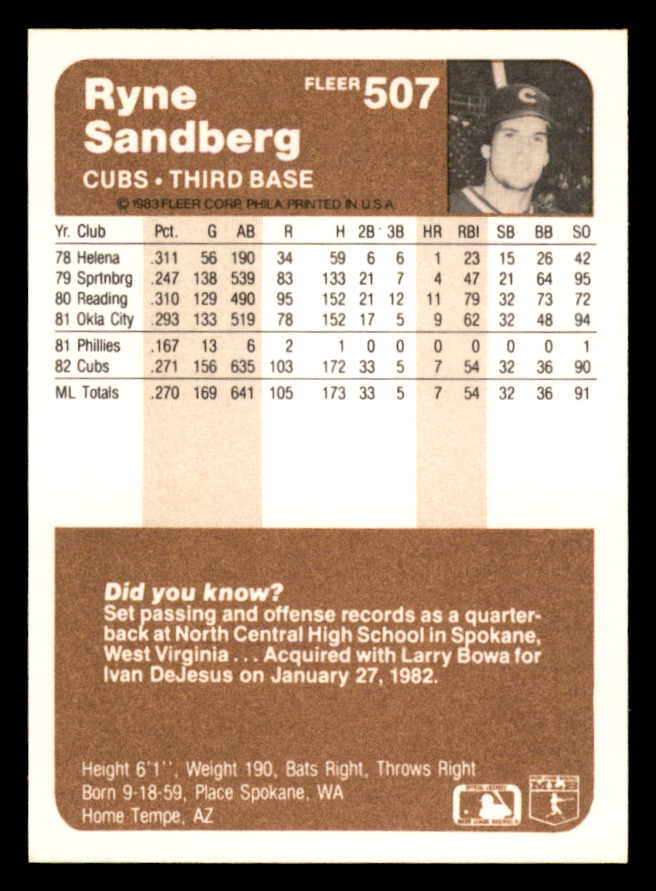 1983 Fleer #507 Ryne Sandberg Cubs EX-MT 547185