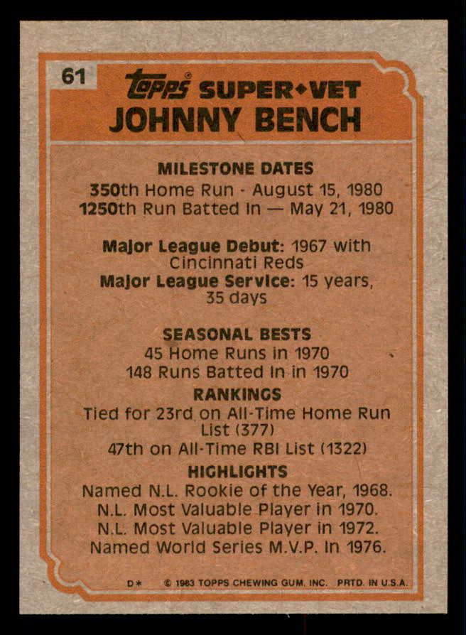 1983 Topps #061 Johnny Bench SV Reds EX-MT 543240