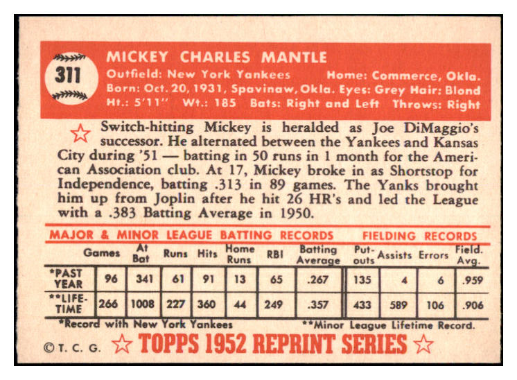 1983 Topps 1952 Reprint #311 Mickey Mantle Yankees EX-MT 531850